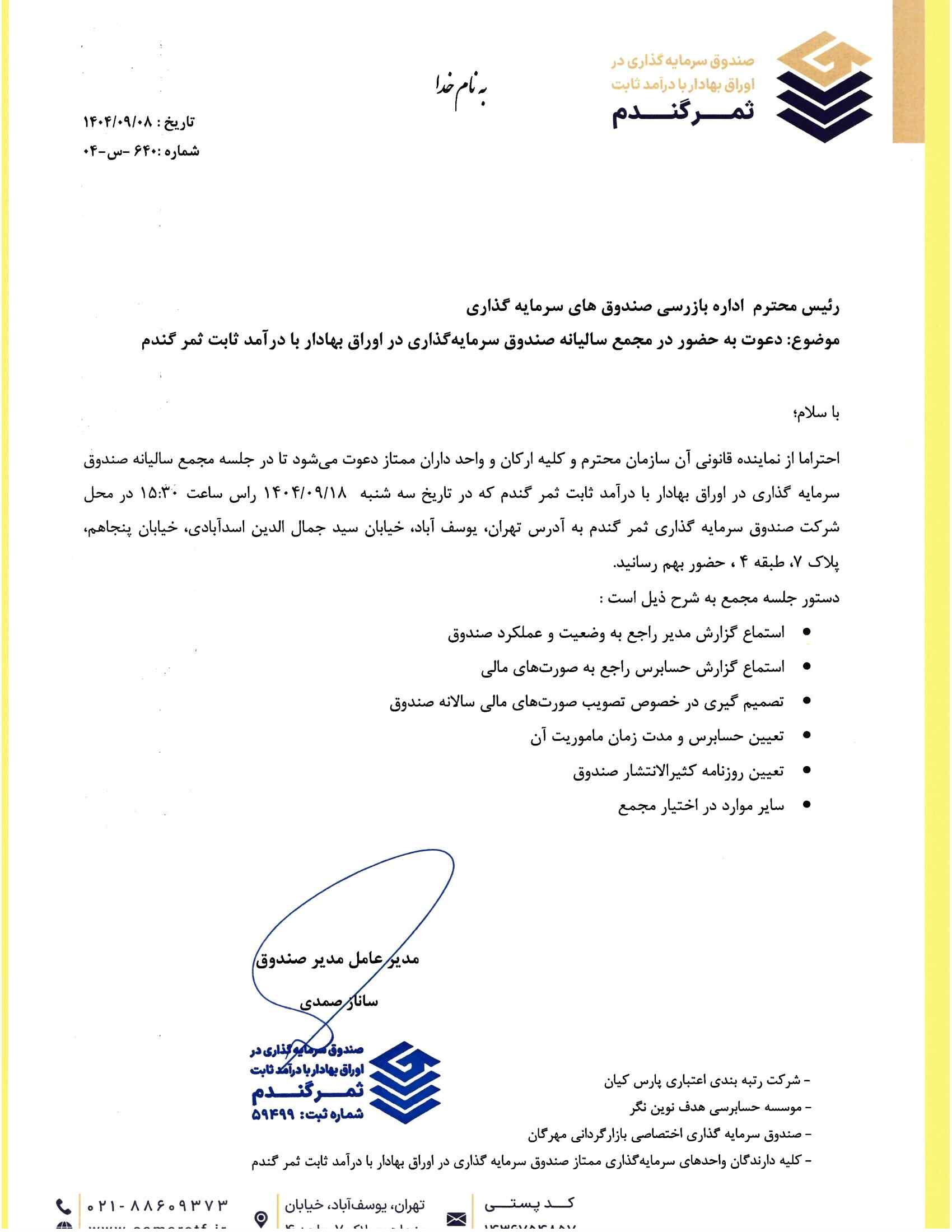 دعوتنامه مجمع صندوق سرمایه گذاری دراوراق بهادار با درآمد ثابت ثمر گندم جهت تصمیم گیری در خصوص تغییر کارمزد ارکان صندوق